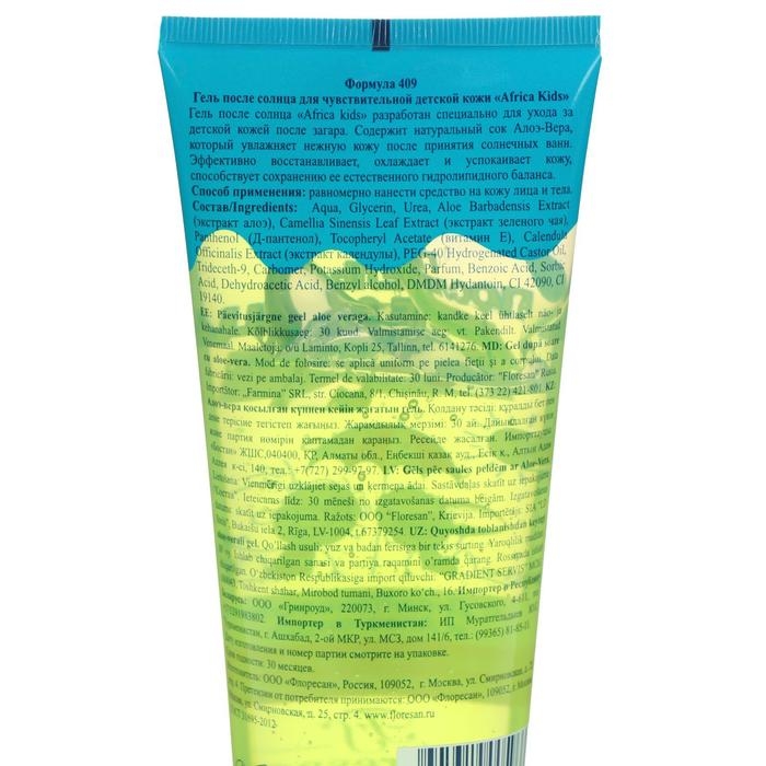 Гель после солнца Africa kids прекрасно ухаживает за детской кожей после загара. Входящий в состав натуральный сок Алоэ вера увлажняет лицо и тело после принятия солнечных ванн, не вызывая ощущения сухости. Средство эффективно восстанавливает, охлаждает и успокаивает кожу, а также сохраняет её естественный гидролипидный баланс. Способ применения: равномерно нанесите средство на лицо и тело. Для детей от 3-х лет.