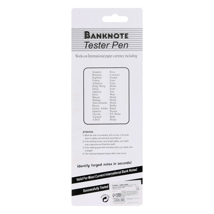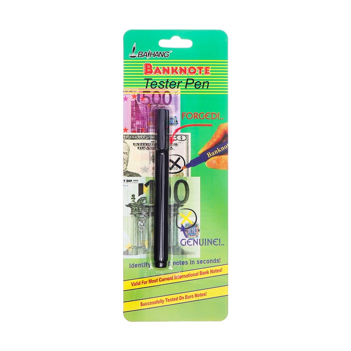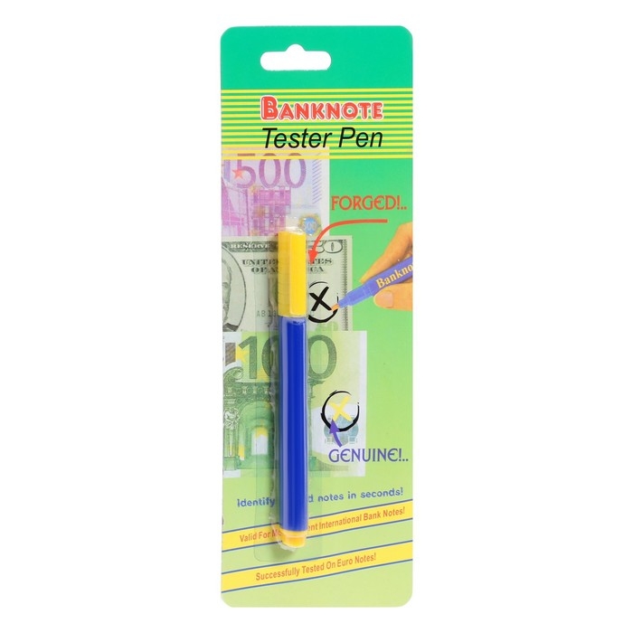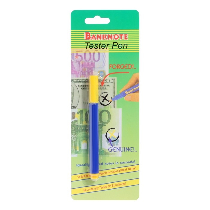 Маркер ручка заправлен специальными высококачественными чернилами, которые реагируют на химический состав краски и бумаги, которые используются при печати банкнот.