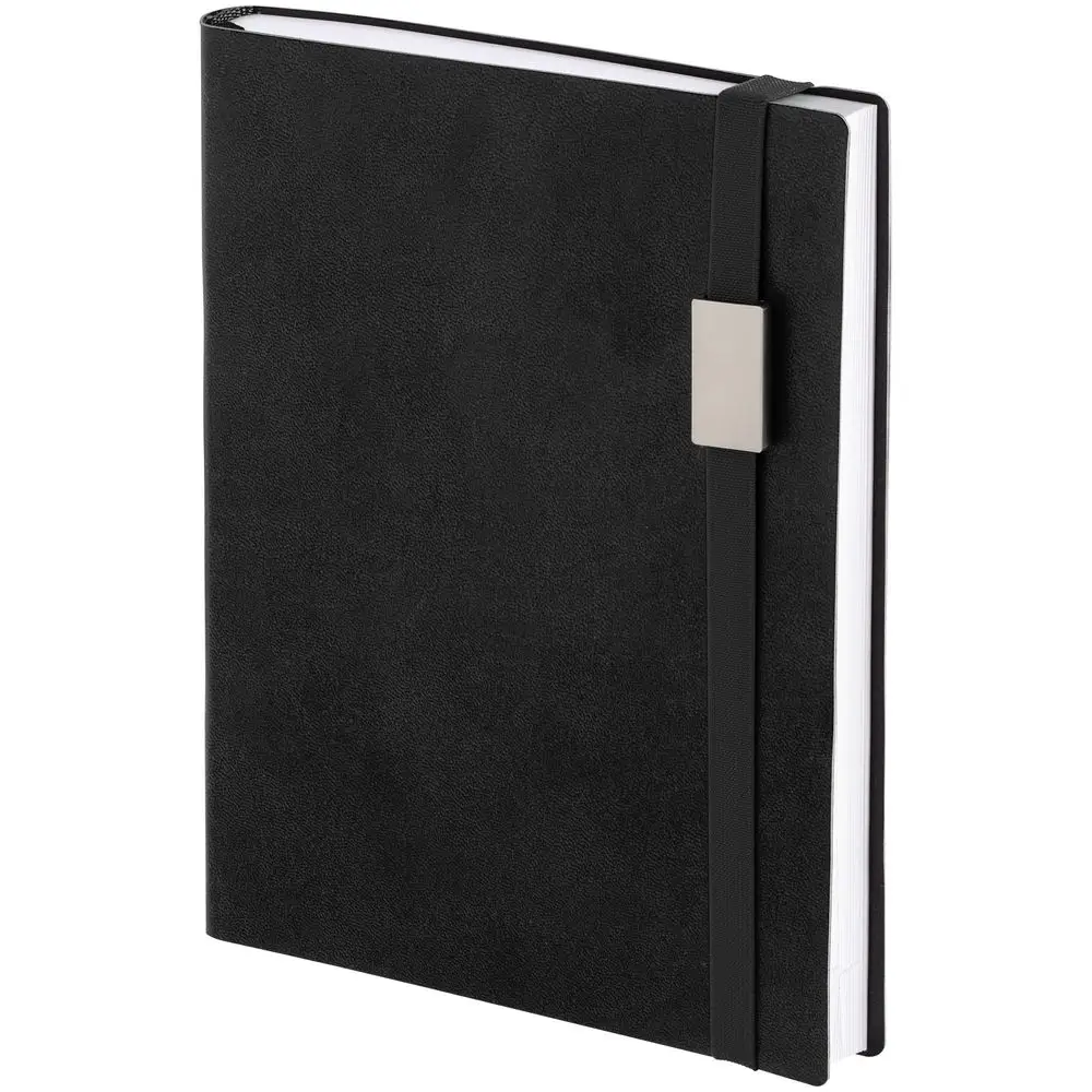 Ежедневник с гибкой обложкой выполнен из материала Brand, черный АА, и дополнен резинкой шириной 1 см с металлическим шильдом, капталом, ляссе черного цвета.
