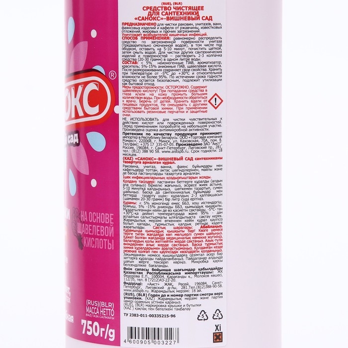 Гель для сантехники "Санокс", вишневый сад, против ржавчины, 750 мл