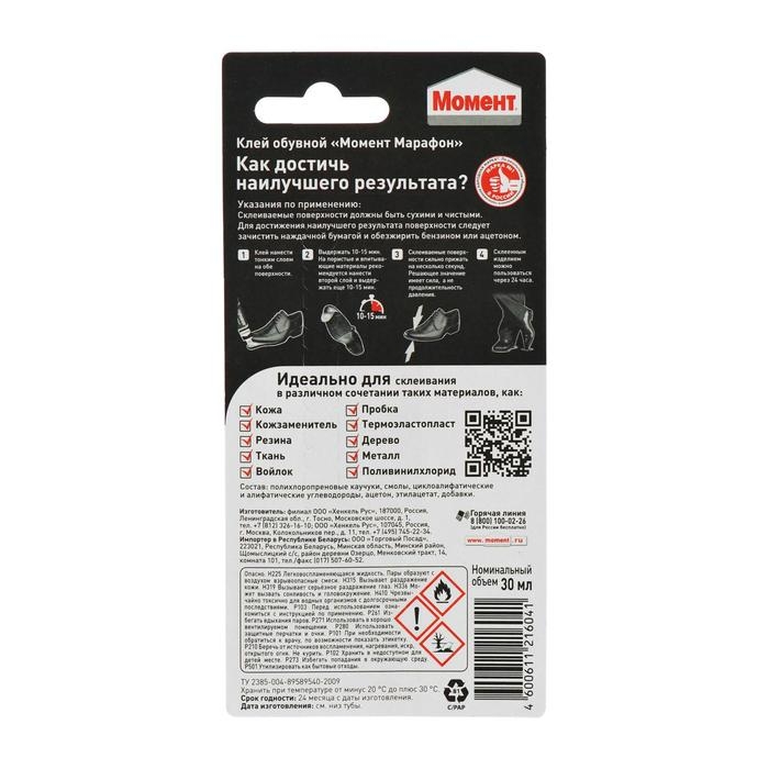 Момент Марафон является специальным обувным клеем, отлично подходящим для починки любых видов обуви из различных материалов в любых комбинациях.