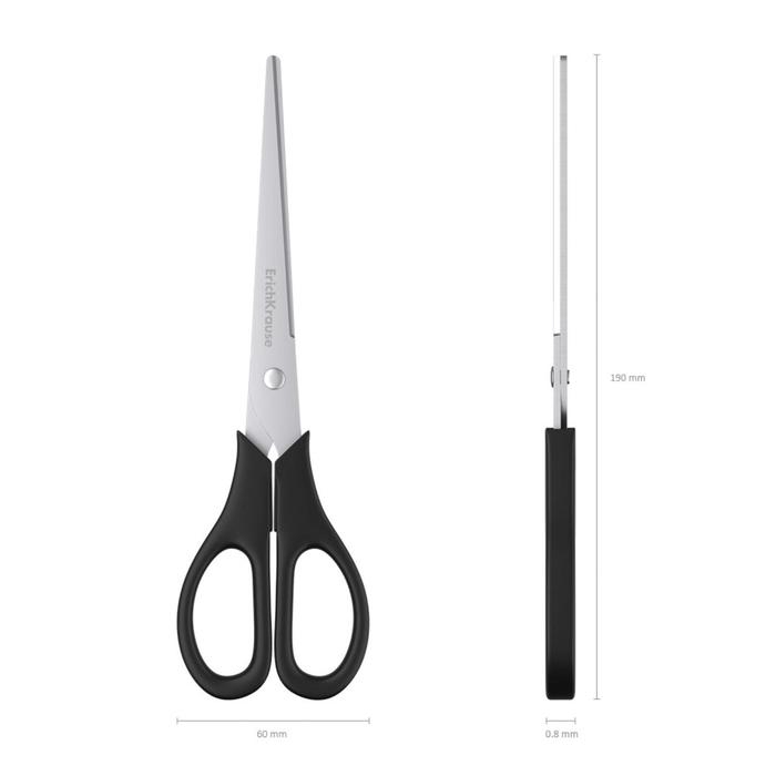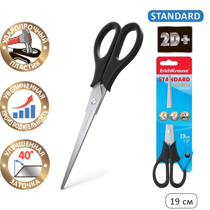 Ножницы ErichKrause Standard, 19 см, двойная заточка, нержавеющие лезвия, ударопрочный пластик, блистер, чёрные