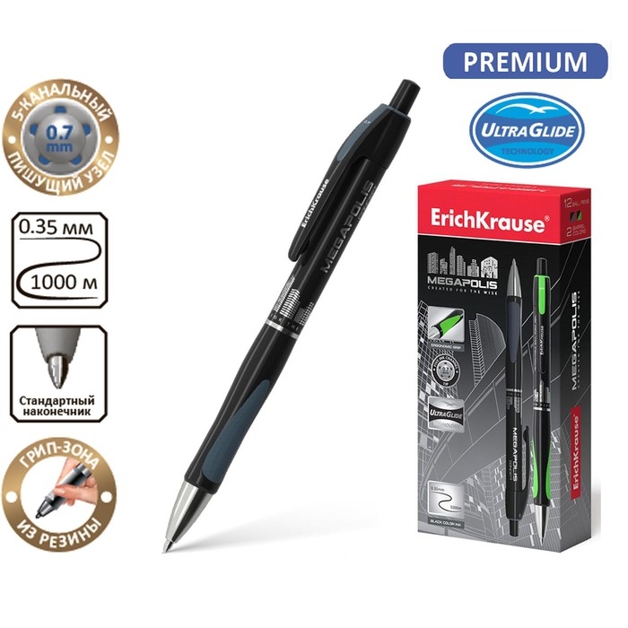 Автоматическая шариковая ручка Matic&Grip с металлизированными элементами, стандартным типом пишущего узла, заменяемым стержнем и уникальной технологией Ultra Glide. Ручка имеет круглый глянцевый корпус с эргономичной грип-зоной, оснащенной двумя резиновыми вставками. Цвет корпуса соответствует типу чернил. 5-канальный пишущий узел с диаметром шарика 0.7 мм в сочетании с чернилами пониженной вязкости обеспечивает мягкое и быстрое письмо без усилий. Длина непрерывной линии составляет 1000 м при толщине 0.35 мм, что является высоким показателем в своей категории. Модель MEGAPOLIS® Concept имеет узнаваемую запатентованную форму, обладает великолепной эргономикой и стала абсолютным бестселлером в ассортименте автоматических шариковых ручек ErichKrause® более чем в пятидесяти странах мира.
