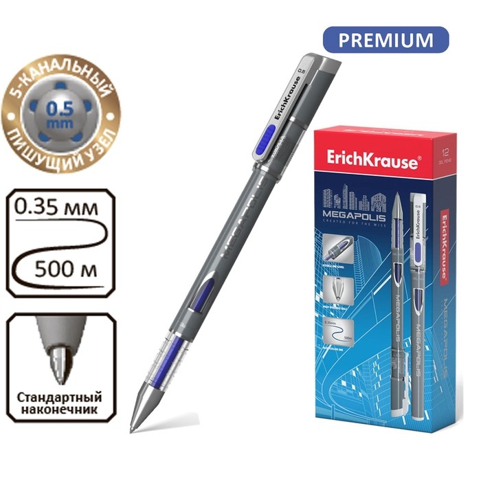 Ручка гелевая ErichKrause MEGAPOLIS GEL, узел 0.5 мм, чернила синие, длина линии письма 500 метров