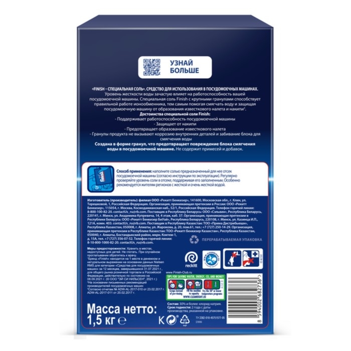 Уровень жесткости воды зачастую влияет на работоспособность вашей посудомоечной машины. Специальная соль Finish с крупными гранулами способствует правильной работе ионообменника, тем самым помогая смягчать воду и защищая посудомоечную машину от образования известкового налета и накипи, что также помогает предотвратить появление пятен и водных подтеков на вашей посуде. Создана в форме гранул, что предотвращает повреждение блока смягчения воды в посудомоечной машине, а также не вызывает коррозию внутренних деталей. Не содержит примесей и добавок. Необходимо добавлять соль для посудомоечных машин в специальный резервуар вашей посудомоечной машины. Не забывайте регулярно добавлять соль для посудомоечных машин, если вы заметите, что ее осталось мало. В некоторых машинах о низком уровне соли сигнализирует мигание красного индикатора. В этом случае обязательно добавьте соль!