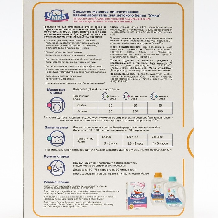 Пятновыводитель "Умка", порошок, для детского белья, 400 г
