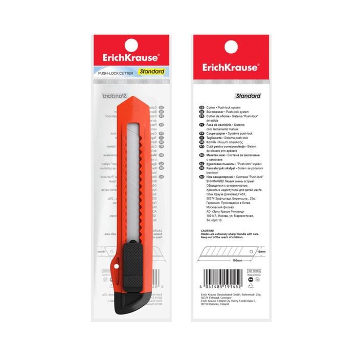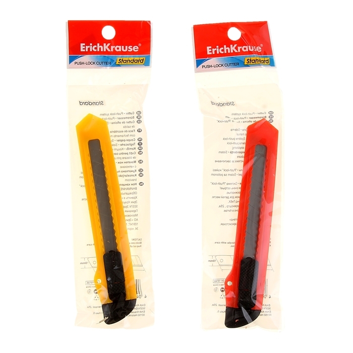 Нож канцелярский 18 мм, ErichKrause Standart, с системой фиксации лезвия push-lock и насадкой для безопасного отделения сегмента лезвия, МИКС