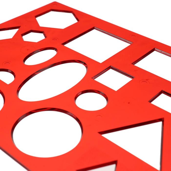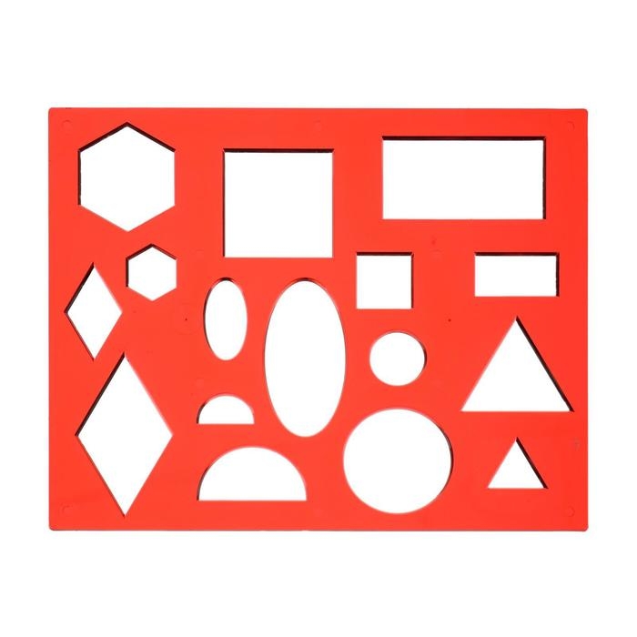 В трафарете вырезаны такие фигуры, как: круг, овал, полукруг, ромб, квадрат, прямоугольник и шестиугольник, которые встречаются дважды в разных размерах. Трафарет позволяет ребенку выучить названия и вид различных фигур, одновременно развивая мелкую моторику и навыки рисования, а также может применяться для оформительских работ.