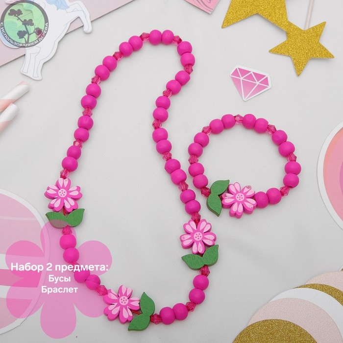Набор детский «Выбражулька» 2 предмета: бусы, браслет, цветы крупные, цвет ярко-розовый