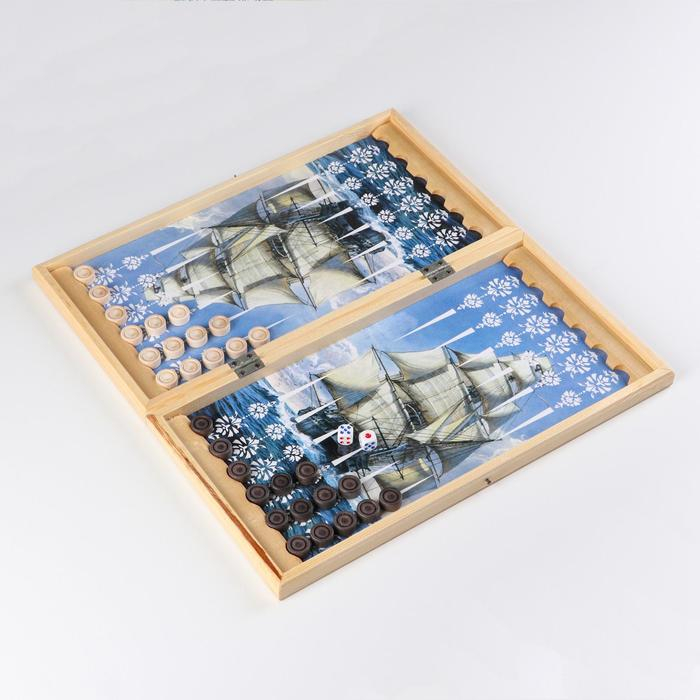 Нарды деревянные большие, настольная игра "Парусник", 40 х 40 см, с полем для игры в шашки