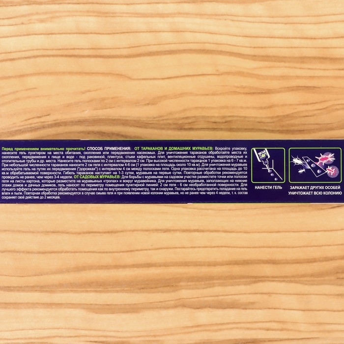 Инструкция: Вскройте упаковку, нанесите гель пунктиром на места обитания, скопления или передвижения насекомых. Для уничтожения тараканов обработайте места их скопления, передвижения к пище и воде - под раковиной, плинтуса, стыки кафельных плит, вентиляционные отдушины, водопроводные и отопительные трубы и др. места. Нанесите гель полосками по 2 см с интервалом 2 см. При высокой численности тараканов 1 упаковка на 25 кв.м. При небольшой численности тараканов наносите 2 см геля с интервалом 4-6 см (1 упаковка на площадь около 50 кв.м). Для уничтожения муравьев используйте гель на путях их передвижения (""дорожках"") с интервалом 4 см между полосками геля. Одна упаковка 35 г рассчитана на площадь 50 - 75 кв.м обрабатываемой поверхности. Гибель тараканов наступает на 1-3 сутки, муравьев на первые сутки. Повторные обработки рекомендуется проводить не ранее, чем через 3-4 недели.