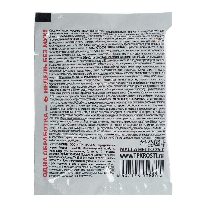 Высокоэффективное средство для уничтожения мух и ос в производственных и жилых помещениях, гостиницах, общежитиях, предприятиях общественного питания, магазинах, складах, животноводческих комплексах и т. д. Препарат содержит особые пищевые аттрактанты, а также половой феромон (химический аттрактант), привлекающий мух на расстоянии – что усиливает привлекательность приманки для насекомых и значительно повышает эффективность. Активное вещество препарата – мощный инсектицид, обладающий почти мгновенным эффектом. Благодаря стабильности действующего вещества, препарат отличается выраженным пролонгированным действием. С целью повышения эффективности препарата и значительного улучшения экономии расходов разработана новая инновационная схема обработки помещений. Метод основывается на применении подложек - метод нанесения мазками. Подложки развешиваются после полного высыхания препарата. Продолжительность остаточного действия средства при данном способе обработки составляет 6-8 недель. Метод нанесения способом опрыскивания рекомендован в помещениях с легко моющимися, не впитывающими гладкими поверхностями. Продолжительность остаточного действия препарата при данном способе обработки составляет 4-6 недель. Раствор препарата при нанесении не оставляет разводов. Состав: ацетамиприд, консерванты, пищевые аттрактанты