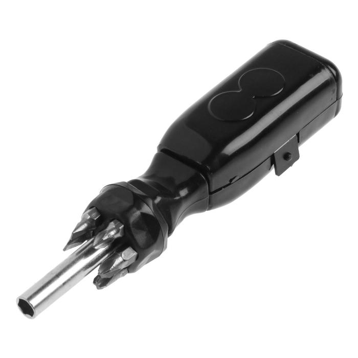 Инструмент изготовлен из прочного и высококачественного металла, оснащён эргономичной пластиковой рукояткой, которая также служит кейсом для хранения бит и головок.