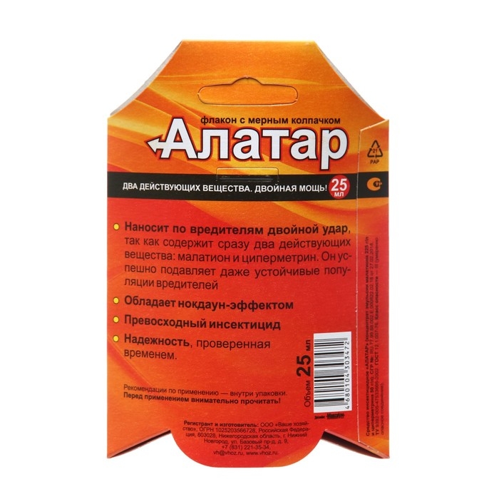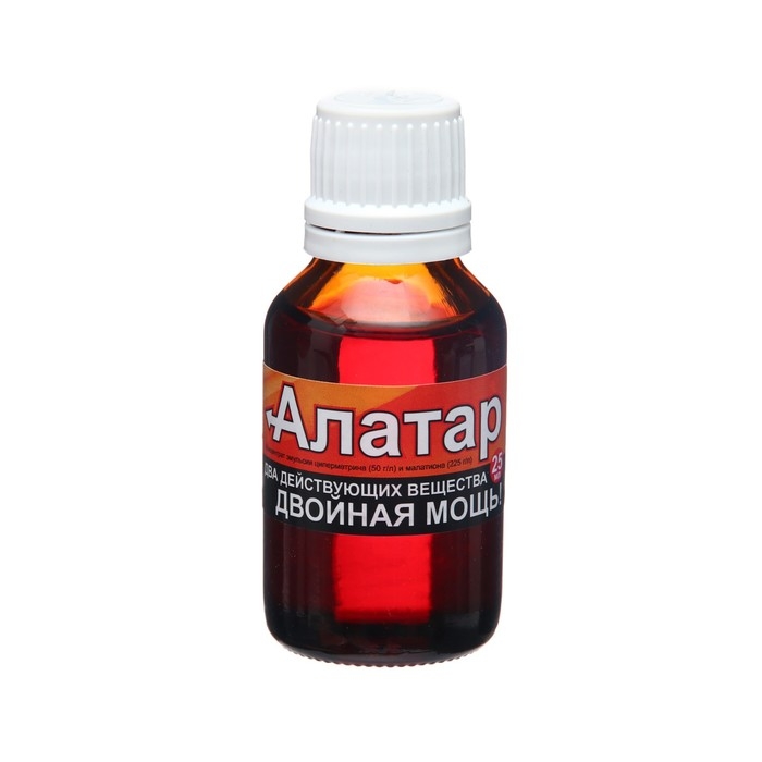 Это универсальный препарат, он эффективен против множества вредителей (плодожорок, белянок, совок, листоверток, тлей, колорадского жука, медяницы, трипсов, белокрылок, долгоносиков, клещей и т.д.). «Алатар» защитит от вредителей большинство садовых и огородных культур на Вашем участке (капусту, огурцы, томаты, яблоню, смородину, малину, цветы и т.д.). «Алатар» наносит по вредителям двойной удар, так как содержит сразу два действующих вещества: малатион и циперметрин. Он успешно подавляет даже устойчивые популяции вредителей и обладает синергическим эффектом. Входящий в его состав прилипатель препятствует скатыванию раствора с листьев и смыванию дождем, удлиняет период защитного действия.