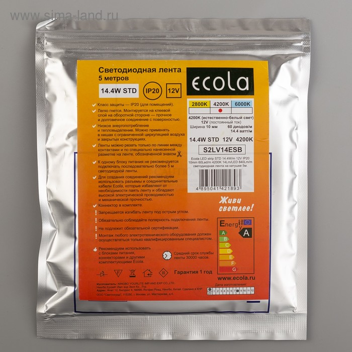 Светодиодная лента Ecola STD 5 м, IP20, SMD5050, 60 LED/м, 14.4 Вт/м, 12 В, 4200К