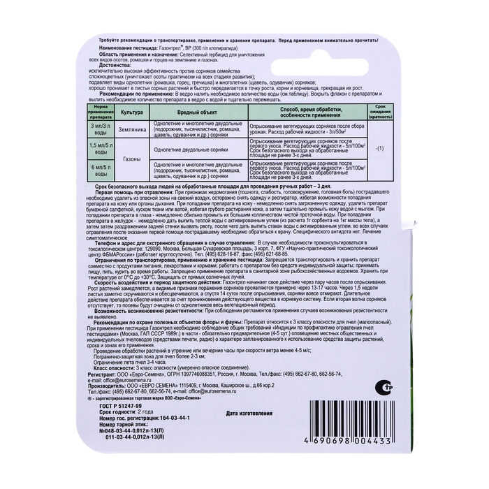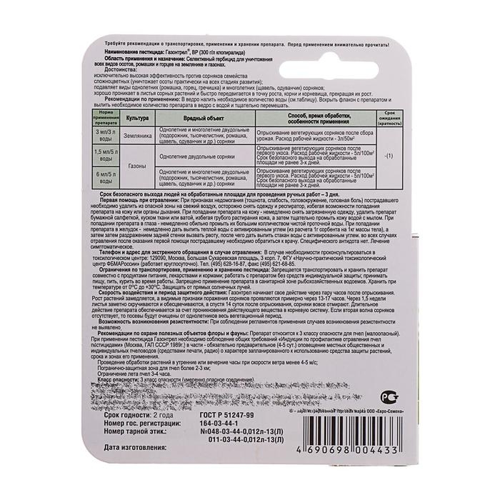 Земляника (однолетние и многолетние двудольные сорняки) - 3 мл/3 л воды. Опрыскивание вегетирующих сорняков после сбора урожая. Расход – 3 л/50 м².
