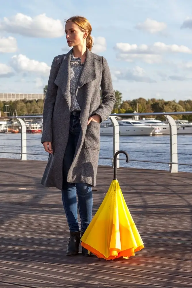 Это зонт-наоборот, зонт-наизнанку. Складываясь после дождя, он прячет мокрую поверхность в себя, а сухая остается снаружи. Для просушки его можно не только подвесить за ручку, как обычные зонты, но и поставить прямо на пол в полусложенном состоянии. Итог — мягкая щадящая просушка и минимум занятого мокрым зонтиком места.