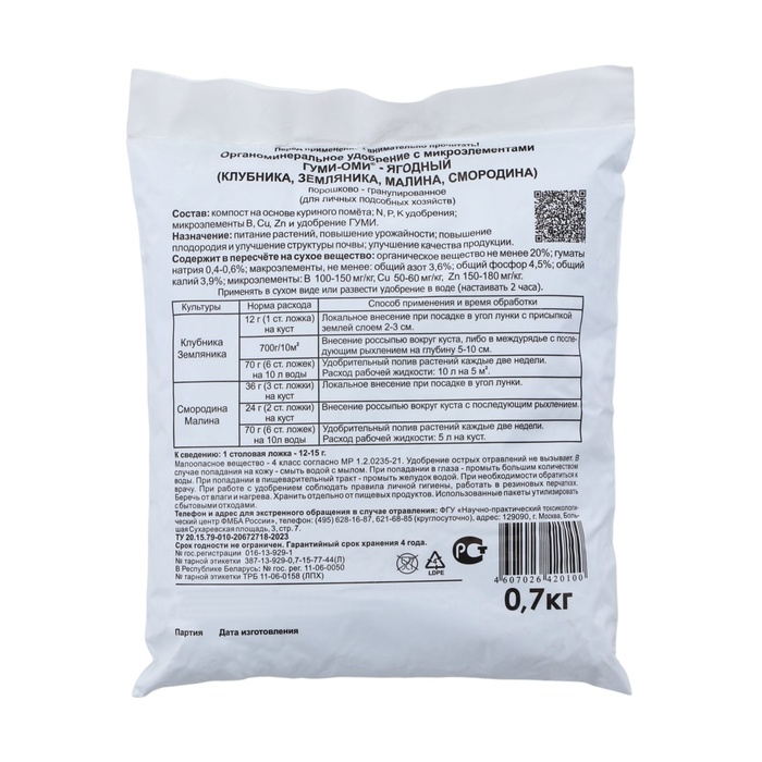Удобрение Гуми-Оми Ягодный для земляники, клубники, малины, смородины, 0,7 кг