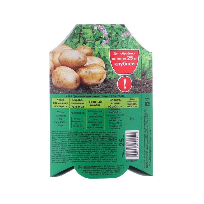 Удобен и экономичен в применении! Флакона 60 мл достаточно для обработки 60 кг клубней (примерно на 2 сотки!). При таком способе применения отсутствует риск попадания препарата на растущие рядом культуры (овощные или зеленные грядки, ягодники, кустарники).