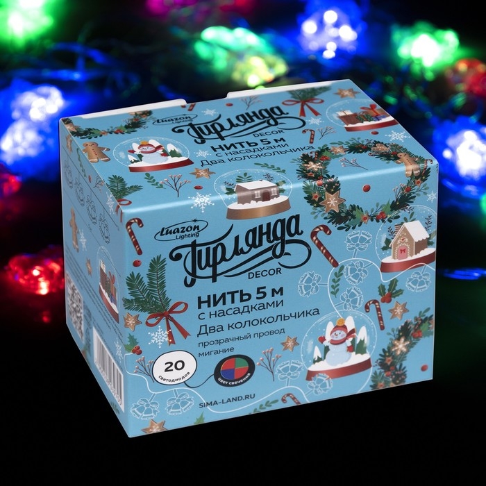 Гирлянда «Нить» 5 м с насадками «Два колокольчика», IP20, прозрачная нить, 20 LED, свечение мульти (RG/RB), мигание, 220 В