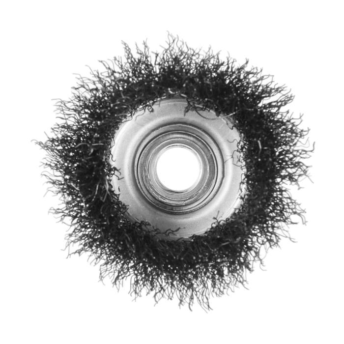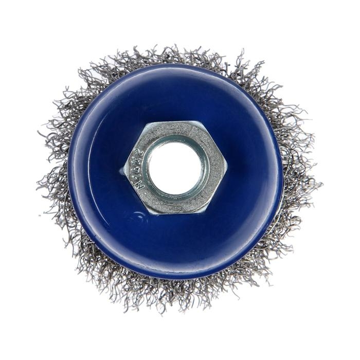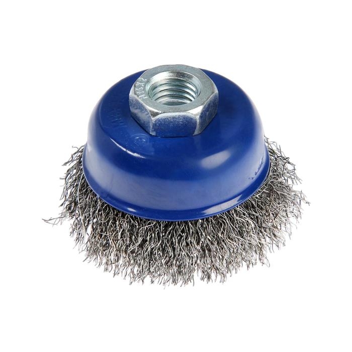 Металлическая щётка чашечного типа ТУНДРА предназначена для зачистки, шлифования, полирования, матирования изделий из различных материалов, удаления ржавчины и грязи с металлических поверхностей в щадящем режиме. Применяется совместно с угловой шлифовальной машиной, тип крепления - М14.