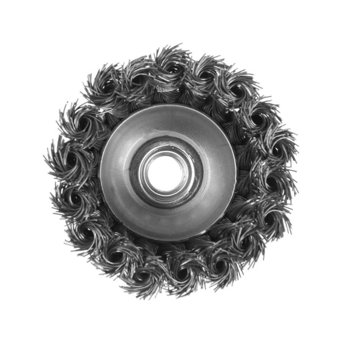 Металлическая кручёная щётка чашечного типа ТУНДРА предназначена для грубой зачистки металлических поверхностей от ржавчины и грязи, удаления неровностей и сглаживания сварных швов. Применяется совместно с угловой шлифовальной машиной, тип крепления - М14.