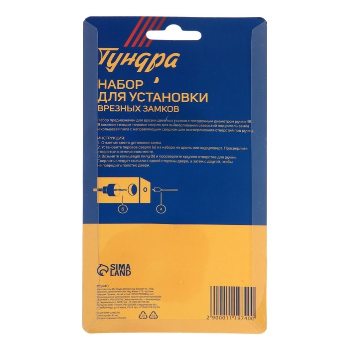 Набор для установки врезных замков ТУНДРА, сверло перовое 22 мм, пила кольцевая 54 мм