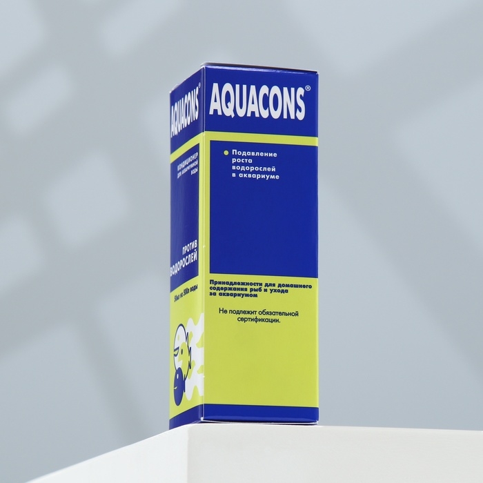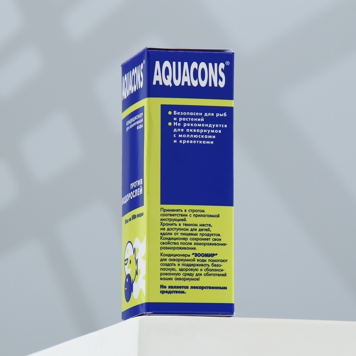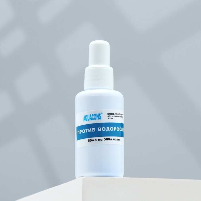 Кондиционер против водорослей «Акваконс» для аквариумной воды 50 мл предназначен для подавления роста водорослей в пресноводных аквариумах. Способ применения: Перед обработкой очистите от водорослей доступные поверхности аквариума, воспользовавшись скребком, губкой и т. п. Очистите по возможности аквариумную воду от образовавшейся взвеси этих водорослей с помощью аквариумного фильтра с подходящим фильтрующим материалом, например, мелкопористой губкой или активированным углём. Потом фильтрующие материалы следует заменить. После проведённой механической очистки аквариума следует определить количество воды в нём, учитывая объём, занимаемый грунтом, растениями, декоративными элементами, оборудованием и т. п., и рассчитать необходимое количество кондиционера. Перед применением содержимое флакона взболтать! Добавить 5 мл кондиционера на каждые 50 л аквариумной воды. После внесения кондиционера воду в аквариуме следует аккуратно перемешать. Эффект действия кондиционера обнаружится через 1-4 недели, в зависимости от вида водорослей и состава воды. Погибшие водоросли удалить механическим способом, как указано выше. После окончания применения кондиционера рекомендуется подменить до 50 % объёма воды в аквариуме. При необходимости процедуру повторить через 10 дней. Превышение указанной дозы кондиционера не допускается. Рекомендации по применению: В рекомендуемом количестве безопасен для рыб и аквариумных растений. Не рекомендуется применять в аквариумах, в которых, кроме рыб, обитают креветки или моллюски. При необходимости временно переместите их в другой аквариум.