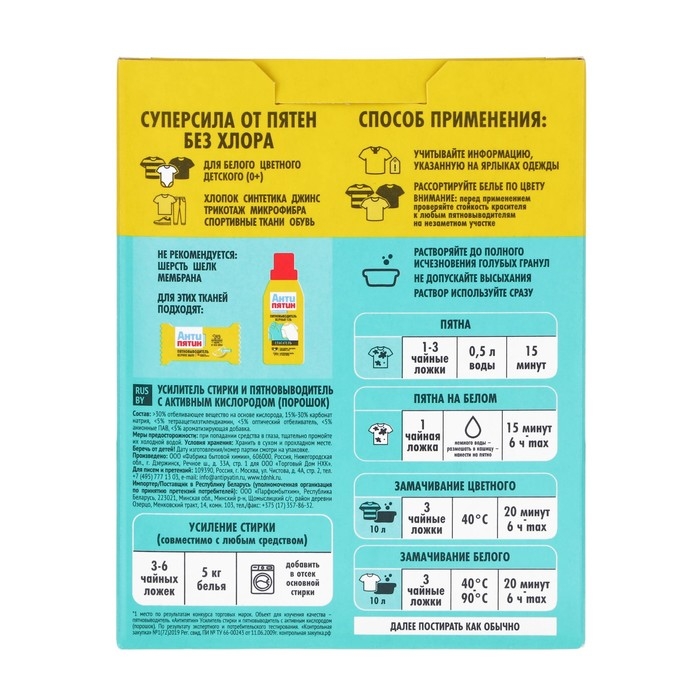 Состав: 30% отбеливающее вещество на основе кислорода, 15%-30% карбонат натрия, <5% тетраацетилэтилендиамин, <5% оптический отбеливатель, <5% анионные ПАВ, <5% ароматизирующая добавка.