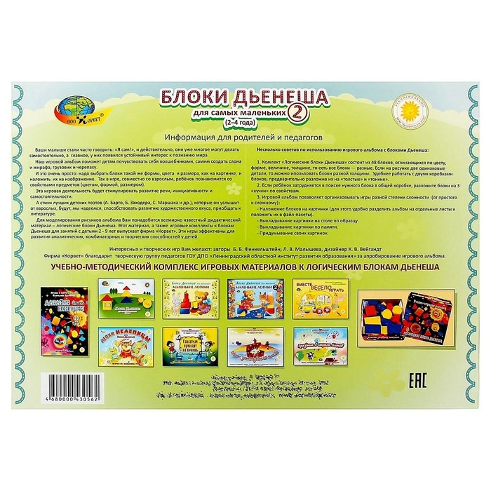«Блоки Дьенеша для самых маленьких 2» - это увлекательный альбом для малышей от 2-3 лет. В игровом материале представлены задания-схемы разного уровня сложности. Задача ребенка: накладывать яркие блоки на фигуры в альбоме, создавать своими руками объемные картинки!