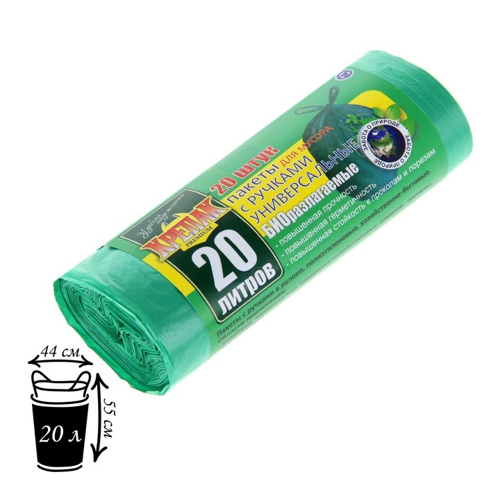 Мешки для мусора «БИОразлагаемые», 20л, с ручками, ПНД, 10 мкм, размер 44×55см, 20 шт, цвет зелёный