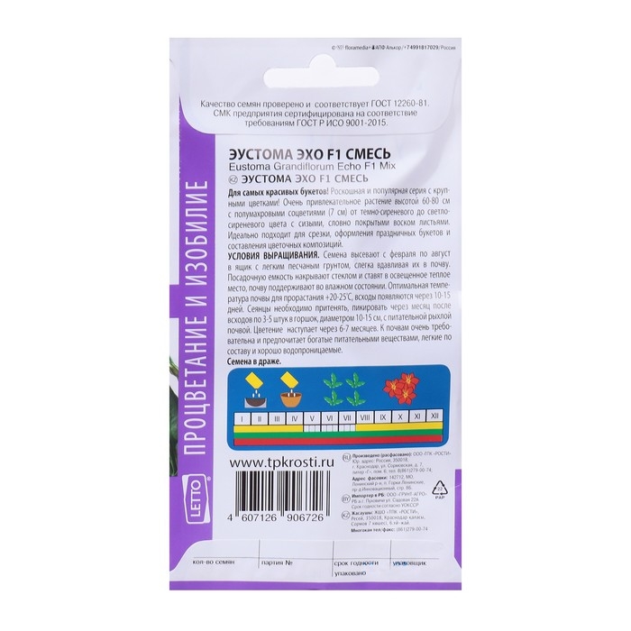 Семена цветов «Эустома Эхо F1 смесь», многолетник, драже, 5 шт. — привлекательное растение высотой 80–100 см с полумахровыми соцветиями (7 см) от тёмно-сиреневого до светло-сиреневого цвета с сизыми, словно покрытыми воском листьями.