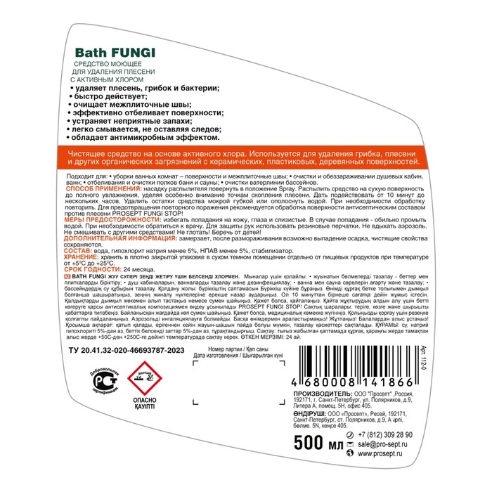 Средство для удаления плесени с дезинфицирующим эффектом Bath Fungy. Концентрат, 0,5л
