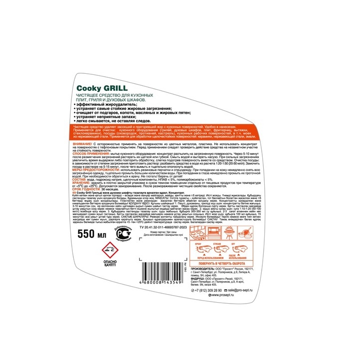 Средство для чистки гриля и духовых шкафов Prosept – высокоэффективное чистящее средство без хлора, которое быстро растворяет пригоревшие и засохшие загрязнения и уничтожает запахи, придавая поверхностям свежесть. Чистящее средство удаляет засохший и пригоревший жир с кухонных поверхностей. Применяется для очистки кухонного оборудования (грилей, духовых шкафов, плит, фритюрниц, вытяжки, стеклокерамики), посуды (сковородок, противней, кастрюль), кухонных рабочих поверхностей, в т.ч. моек из нержавеющей стали. Применяется для обработки щелочестойких поверхностей: керамики, нержавеющей стали, эмали.