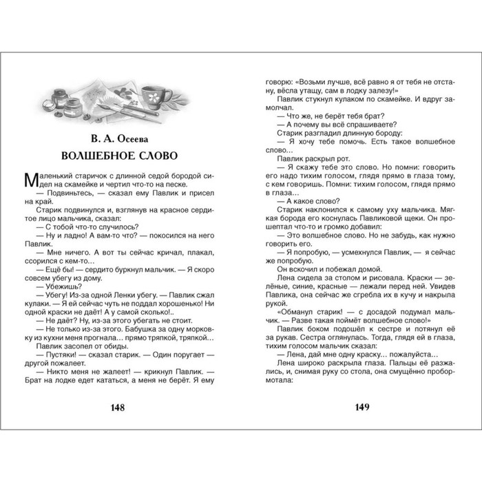 В книгу вошли произведения: А. Чехов «Ванька», «Мальчики», А. Куприн «Чудесный доктор», «Слон», Л. Андреев «Петька на даче», К. Паустовский «Теплый хлеб», «Растрепанный воробей», М. Зощенко «Великие путешественники», Б. Житков «Как я ловил человечков», Л. Пантелеев «Честное слово», «Фенька», В. Железников «Голубая Катя», «Мальчик с красками», Ю. Сотник «Гадюка», В. Драгунский «Сверху вниз, наискосок», «Куриный бульон», «Девочка на шаре», В. Осеева «Волшебное слово», «Почему?», «Синие листья».Художники: В. Челак, И. Панков, В. Коркин, В. Канивец и другие.