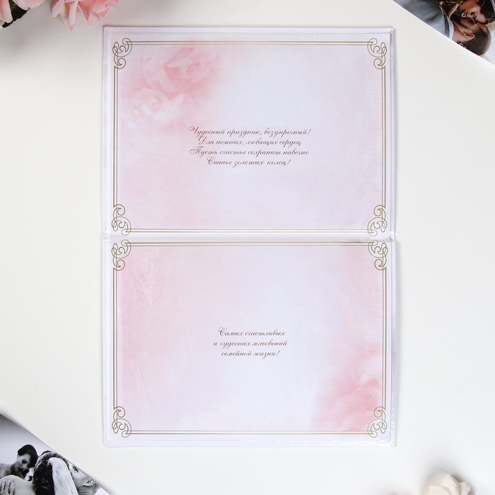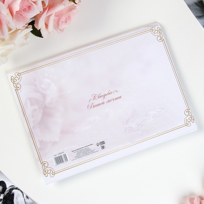 Обложка для свидетельства о заключении брака формата А5 станет лучшим обрамлением для вашего первого совместного документа. Красивая свадебная папка подчеркнёт всю торжественность бракосочетания, она будет напоминать вам о светлом дне свадьбы. В такой папке ваш семейный документ не помнётся, не испачкается и будет сохранять свою красоту всю жизнь. Оригинальный дизайн папки создаст отличное настроение новобрачным и станет хорошим презентом на свадьбу или её годовщину. Папка выполнена из плотного переплётного картона 1,25 мм. Папка с файлом А4.
