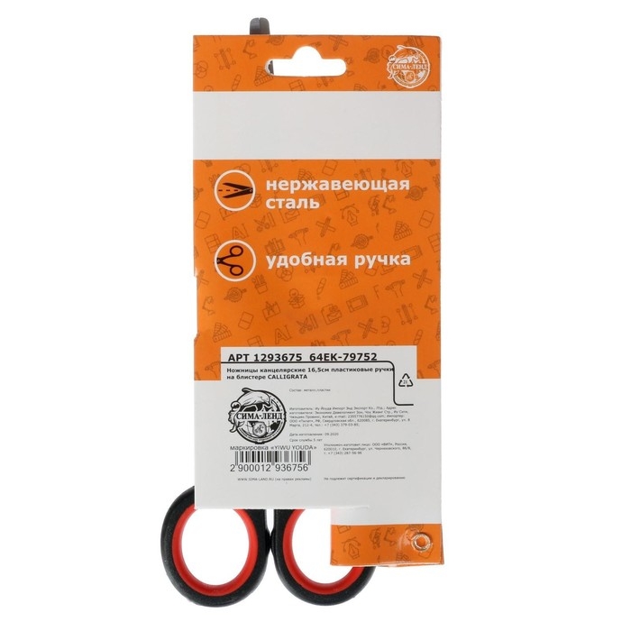 Ножницы канцелярские 16.5 см, "Стандарт", пластиковые ручки, европодвес