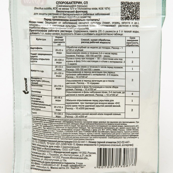 Биологическое средство от грибных и бактериальных болезней Споробактерин, 20 г