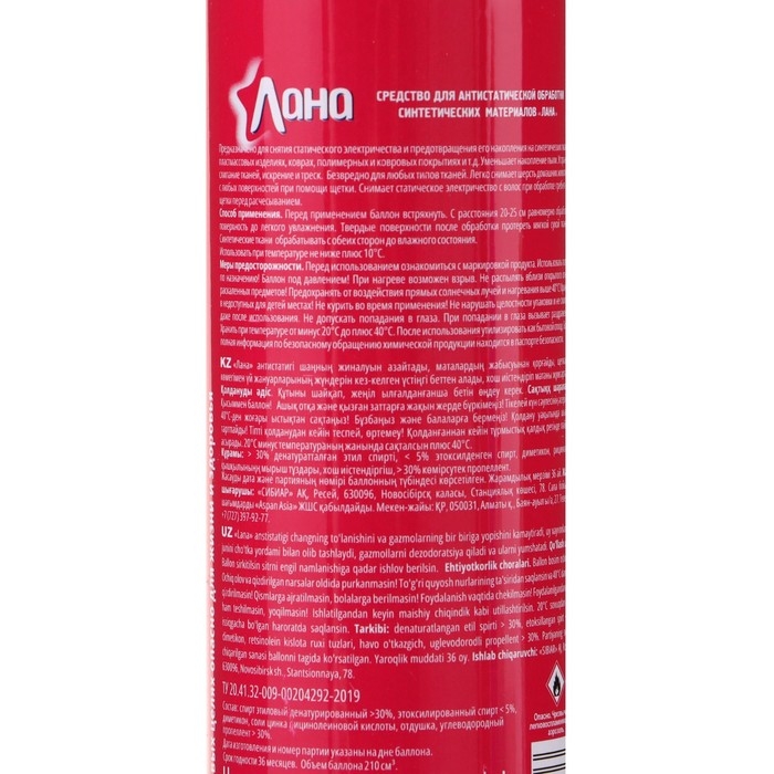 Средство для антистатической обработки торговой марки «Лана» препятствует накоплению статического электричества на синтетических тканях, пластмассовых изделиях, ковровых и полимерных покрытиях.