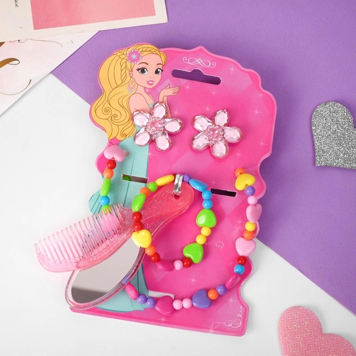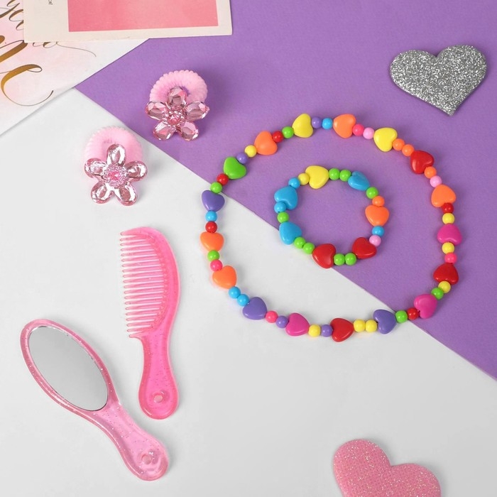 Комплект детский «Выбражулька» 5 предметов: 2 резинки, бусы, браслет, кольцо, цветочек, цвет розовый