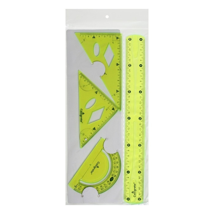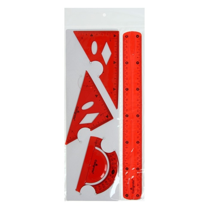 В комплекте: линейка 30 см, 2 угольника, транспортир.