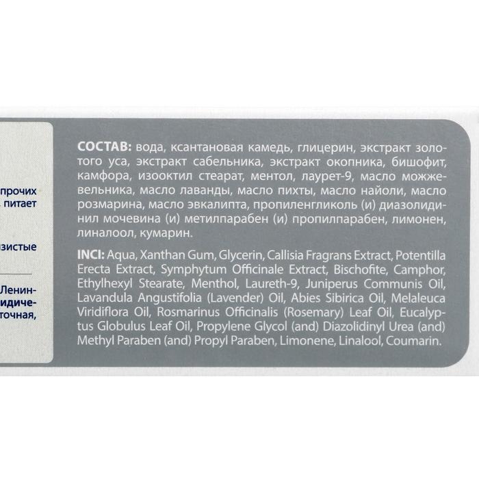 Состав: экстракт золотого уса, бишофит, экстракт окопника, экстракт сабельника, камфора, ментол, масла пихты, лаванды, эвкалипта.