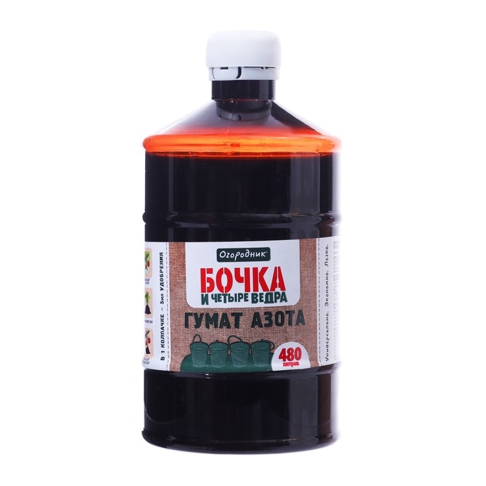 Гумат азота «Бочка и четыре ведра» — органическое удобрение, предназначенное для подкормки овощных, плодовых, ягодных и декоративно-цветочных культур.