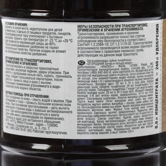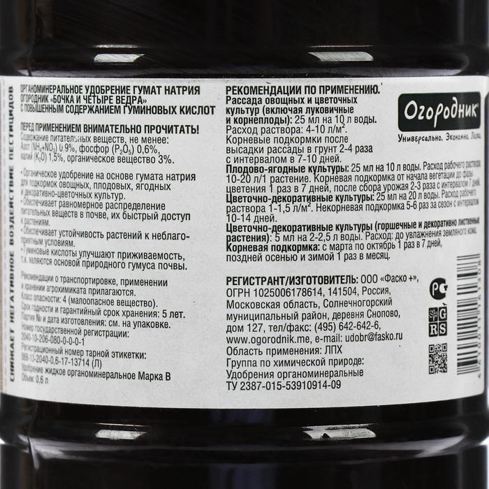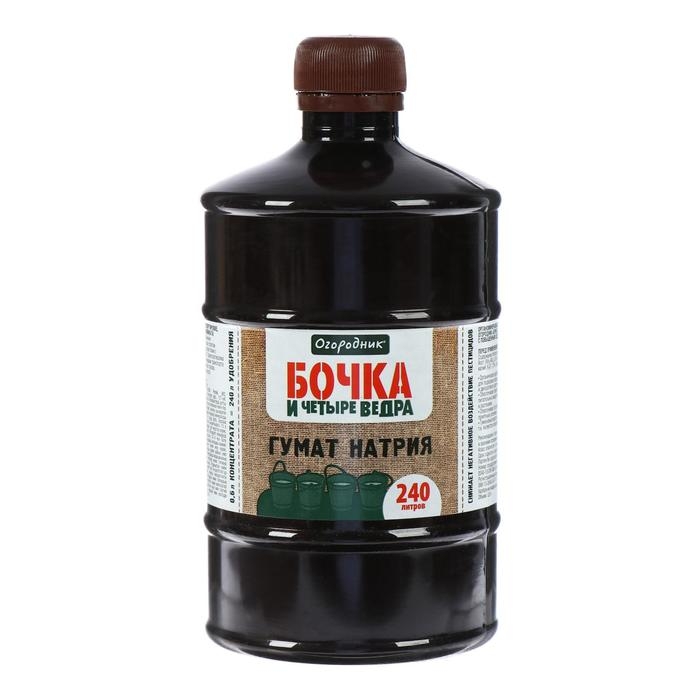 Удобрение органическое жидкое Бочка и четыре ведра, гумат натрия в бутылках, 600 мл