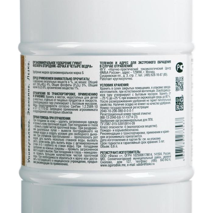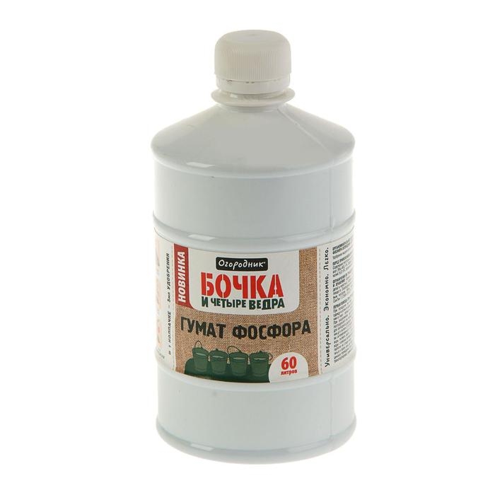 Удобрение органическое жидкое Бочка и четыре ведра, гумат Фосфора в бутылках, 600 мл