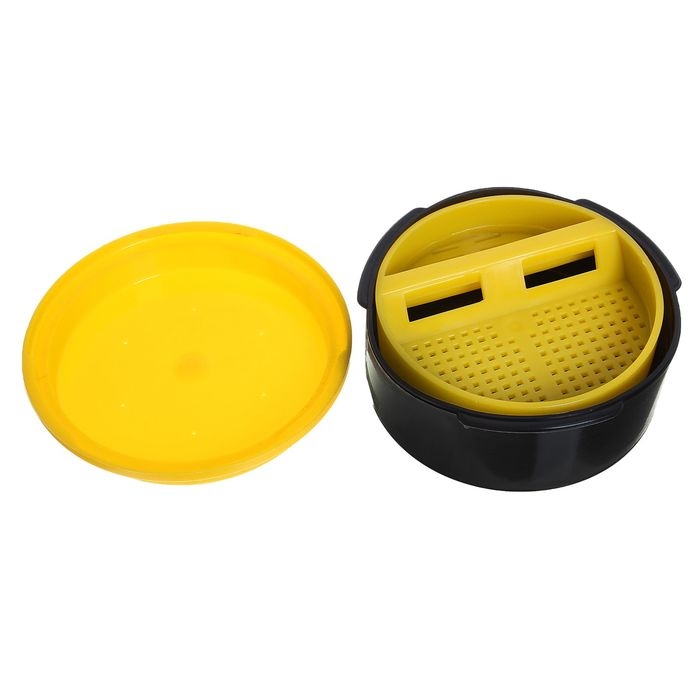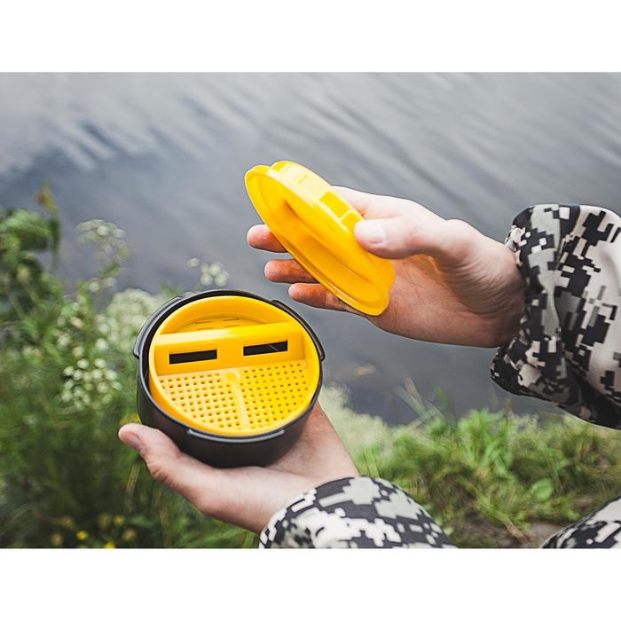 Банка изготовлена из морозоустойчивого пластика и весит всего 70 грамм. Крышка контейнера закрывается плотно, для сохранения насадки живой в ней сделаны небольшие отверстия. Съёмное сито позволяет отделить живого мотыля от мёртвого и очистить его от грязи. Диаметр банки – 10,6 см, высота – 5,6 см.