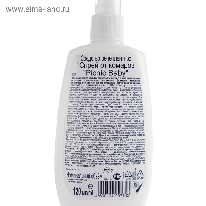 Составвода, этил бутилацетил-аминопропионат (IR3535) - 10%, пропиленгликоль, лаурет-23, экстракт ромашки, парфюмерная композиция, гексаметилентетрамин.ХарактеристикиСпрей от комаров Picnic Baby предназначен для деликатной защиты нежной кожи детей от нападения кровососущих насекомых (комаров, москитов, мокрецов). Специальная формула спрея на основе безопасных репеллентов содержит экстракт ромашки, оказывающий противовоспалительное действие на кожу. При нанесении на открытые участки кожи не вызывает раздражения.ИнструкцияСредство необходимо наносить на открытые участки кожи и на одежду. Время защитного действия от насекомых, при нанесении на кожу — до 2-х часов. Время защитного действия на одежде — около 1 недели (при хранении одежды в полиэтиленовом пакете).