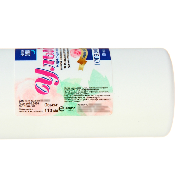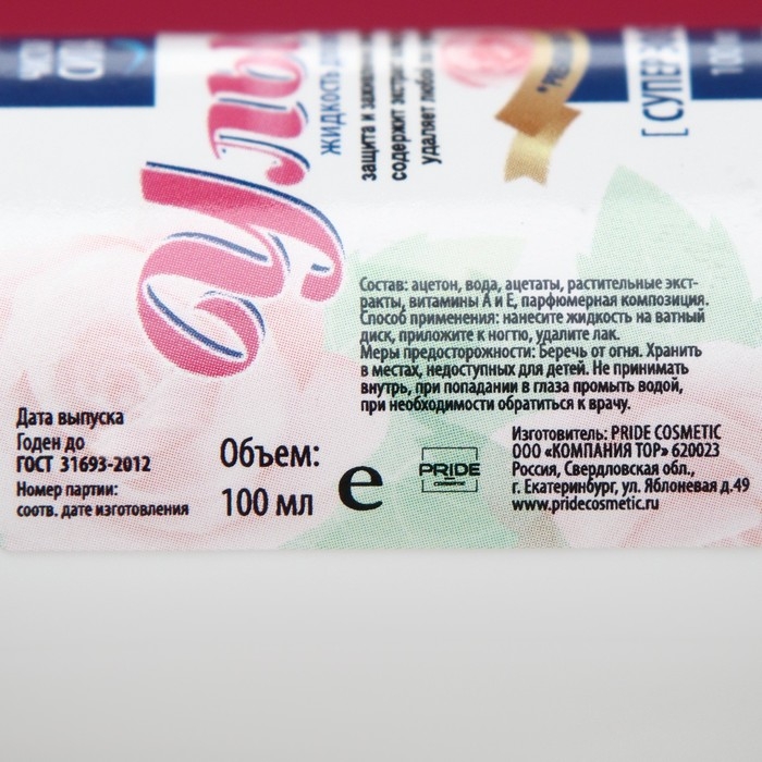 Состав: ацетон, вода, ацетаты, растительные экстракты, витамины А и Е, парфюмерная композиция.
