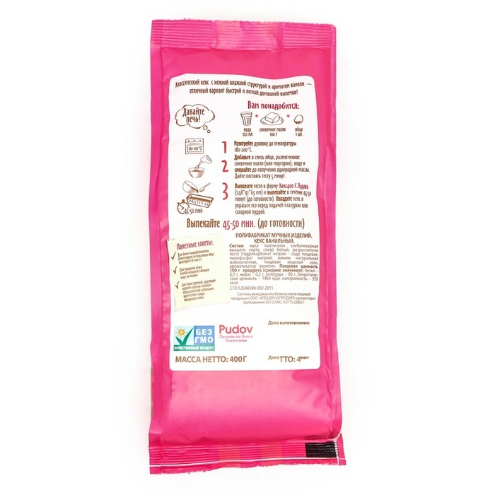 С готовой смесью для выпечки «С.Пудовъ» вам не нужно думать о технологии приготовления правильного теста – об этом мы уже позаботились. Всё, что вам понадобится для выпечки – вода, яйцо и масло. Даже если у вас нет кулинарного опыта, этот кекс получится превосходным, можно не сомневаться. Со способом его приготовления сможет справиться даже ребёнок.