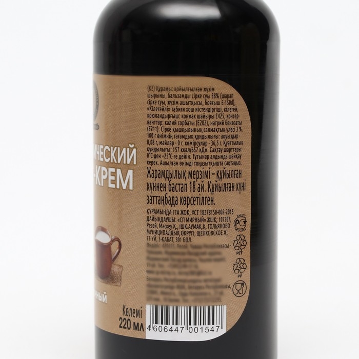 Состав: концентрированный виноградный сок, бальзамический уксус 38 % (винный уксус, виноградное сусло, краситель Е-150d) натуральный ароматизатор «Сливочный», сливки, загуститель конжаковая камедь Е425. Массовая доля уксусной кислоты 3 %. Не содержит консервантов.